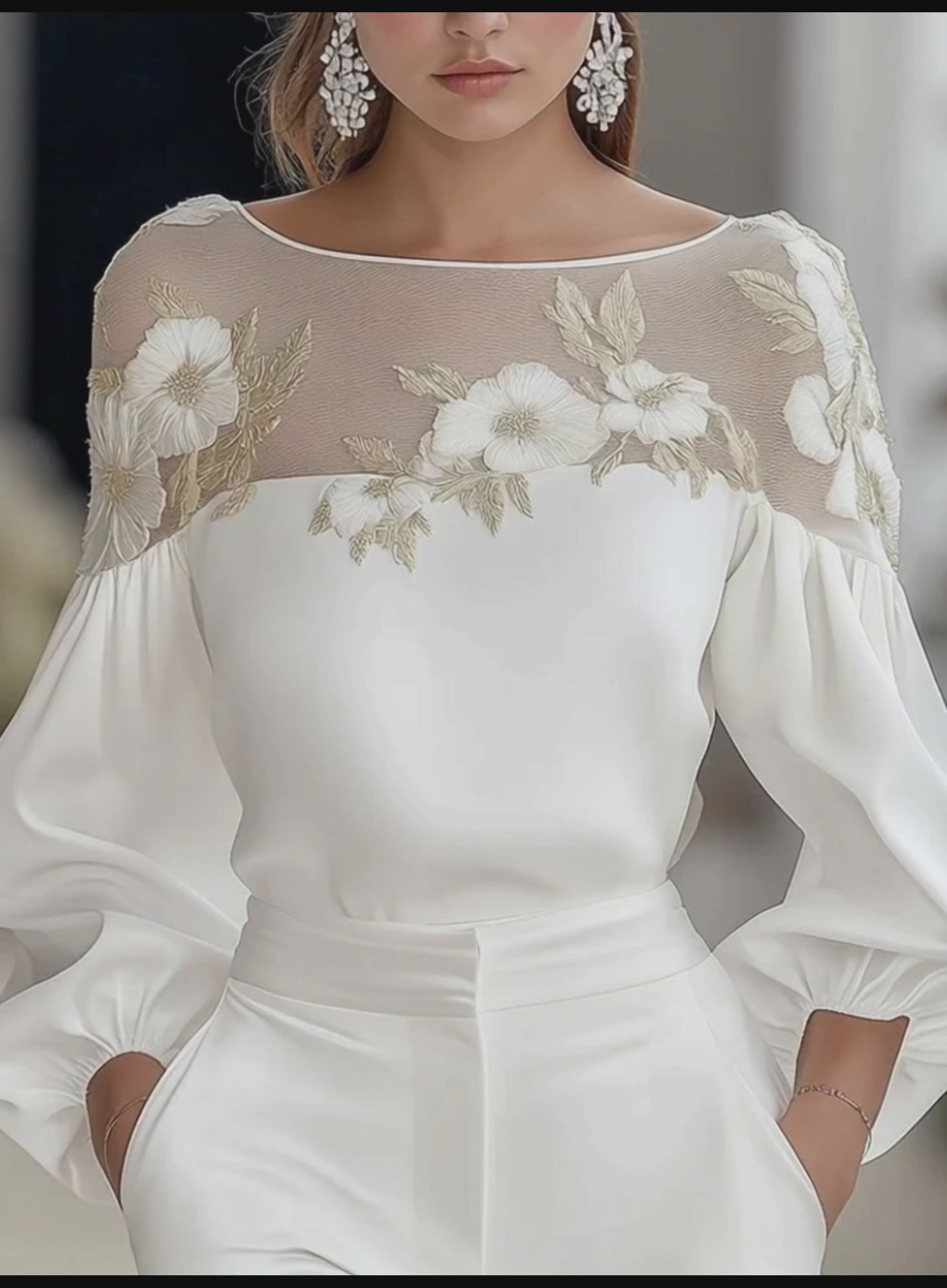 24-Hour-Shipping White Satin Blouse With Silver Plant Embroidery